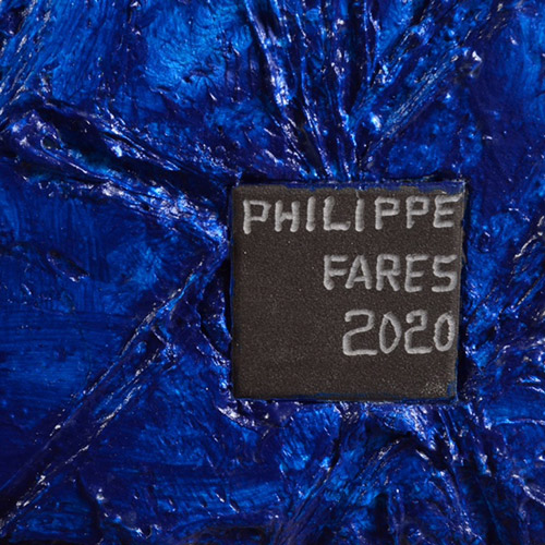 C’est sur une base ciment, que Philippe Fares, a teinté son tableau en bleu.