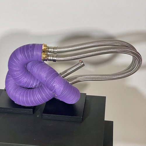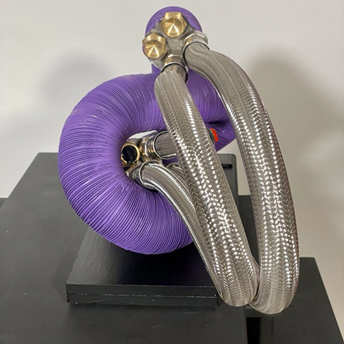 Avec cette œuvre récente, Philippe Fares a imaginé un changement de diamètre des tubes ainsi que le type de matériaux utilisés, dans le cas présent de l’aluminium et de l’acier tressé. On voit notamment, au milieu, le siphon inhalant / exhalant, source de vie de l’Alien.