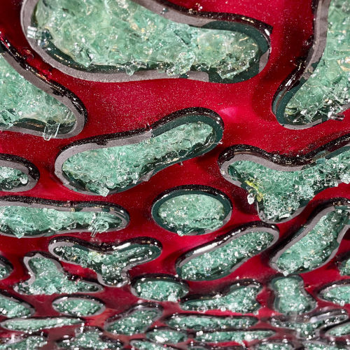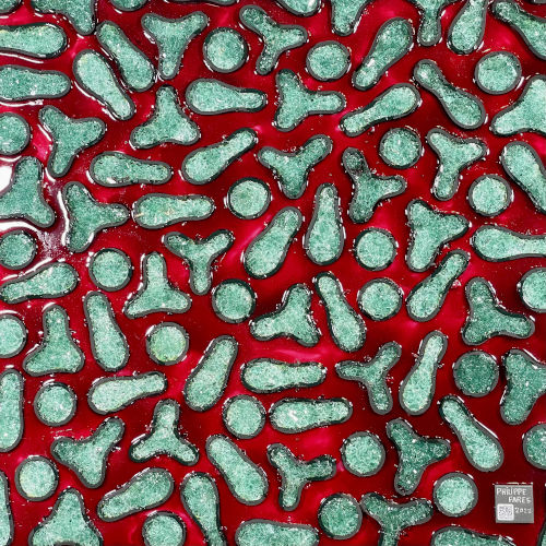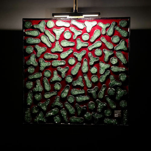 L’artiste, en utilisant la technique du « Float Shards » (calcin saturé dans une résine de coulée) a placé sur sa toile, trois variétés d’ensembles de couleur verte, juxtaposées au plus près et semi-immergés dans un bain de résine teintée de rouge pourpre.