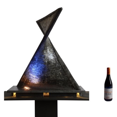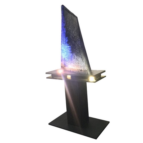 Fragile et mouvante, la lumière bleutée issue du socle en pierre noire, nous entoure littéralement. L’œuvre est faite d’une céramique finement ciselée, qui reflète les faisceaux bleus de l’éclairage.
