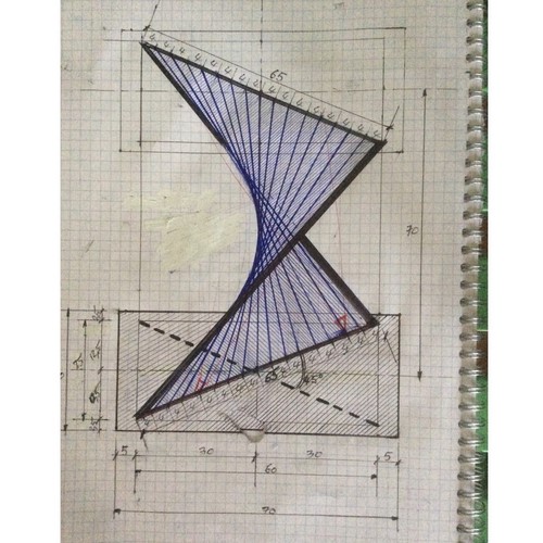 Cette propriété a permis à Philippe Fares, de concevoir le squelette de la figure géométrique, à l’intérieur d’un gabarit parallélépipédique. Il y a en quelque sorte, lancé ses droites, pour obtenir une surface voilée.