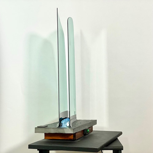 Avec Float Glass 1/6, fait de verre et d’ardoise, l’artiste s’inscrit dans la continuité de la démarche d’éclairage et de rétro éclairage de ses sculptures.