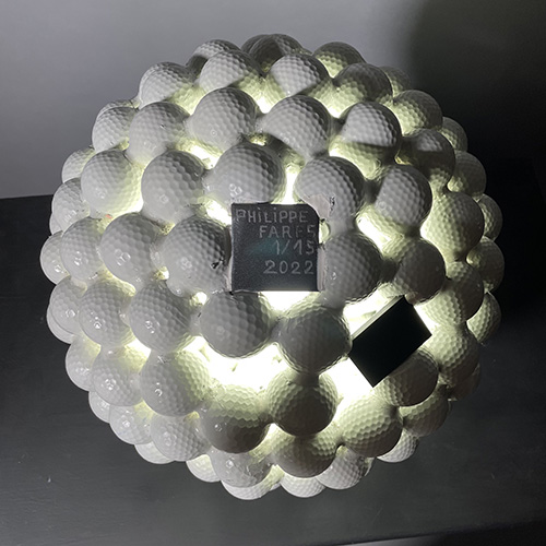Golfariane 1/15 est un solide de révolution, d’un diamètre de 35,8 cm, composé de 160 balles de golf. L’homothétie correspondante est de rapport 8,4.