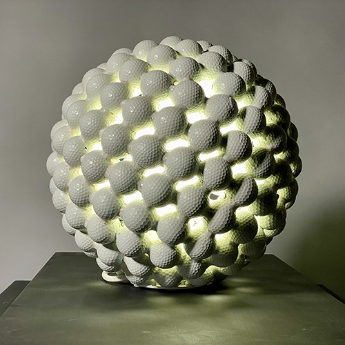 Le maillage plutôt régulier et périodique des balles interconnectées, autorise des vides par lesquels la lumière s’échappe et crée un éclairage blanc qui pixelise l’environnement de l’œuvre.