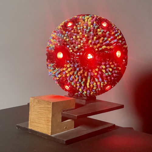 Sphère ciment époxydique, lancettes polyéthylène colorées, LED et carreaux de ciment