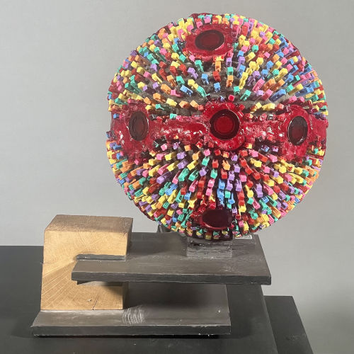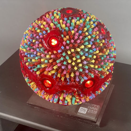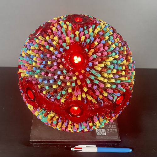 Pour cette sculpture, Il s’agit d’une petite sphère en ciment, dont la surface est tapissée de lancettes multicolores en polyéthylène, avec des cratères rouge-sang qui, lorsqu’ils sont éclairés, suggèrent le sang.