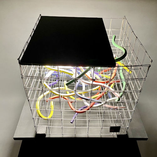 Vivarium est un cube ouvert en treillis soudé, qui abrite des petits serpents multicolores.