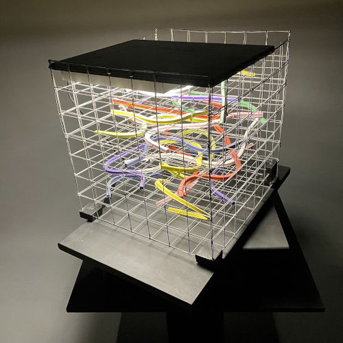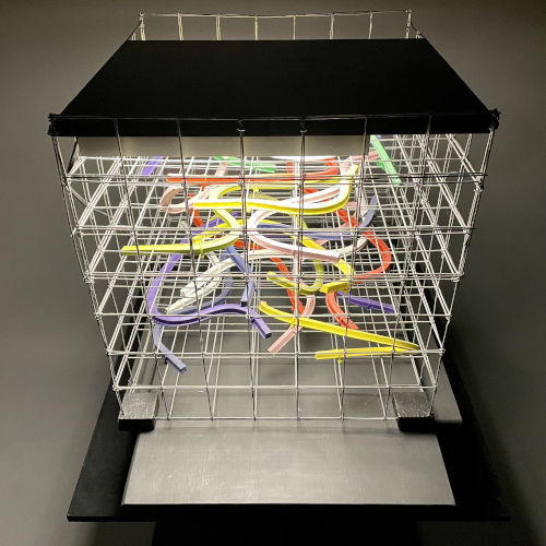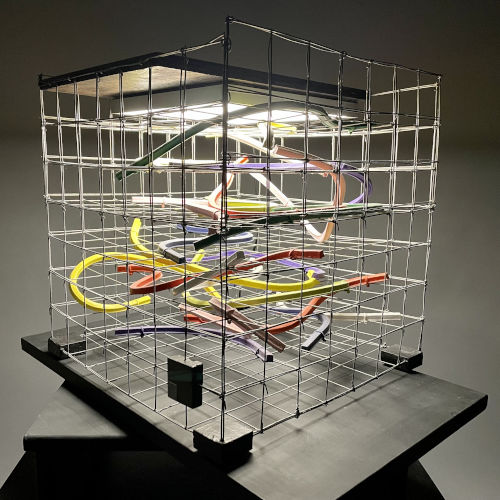 Cage métallique à maille carrée, règles souples peintes, acrylique.