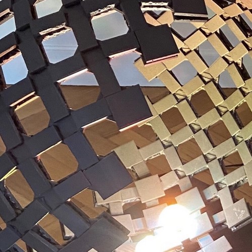 Surprisingly, the intersection of the beams through the upper part creates a shadow cast by the structure on the walls and ceiling. The resulting light effect is two-tone: the projected lozenges are white and their edges are red.